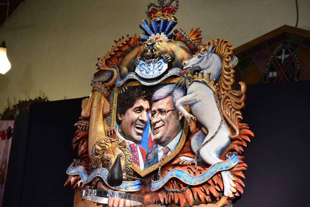 The piece also includes an ornate backdrop that depicts a nefarious-looking Prime Minister Justin Trudeau grinning alongside Stephen Harper.