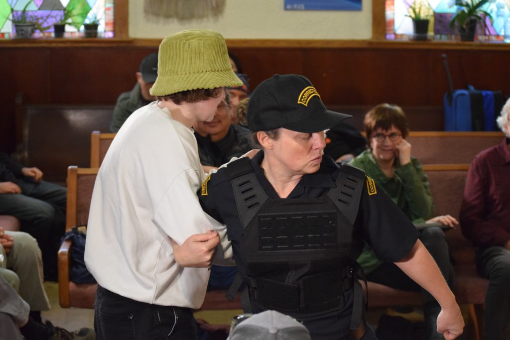 “You hot-headed, limp-wristed, petulant fool,” Kelsall exclaimed, before another arrestee donning a sheriff’s costume, Maureen Curran, dragged her away.