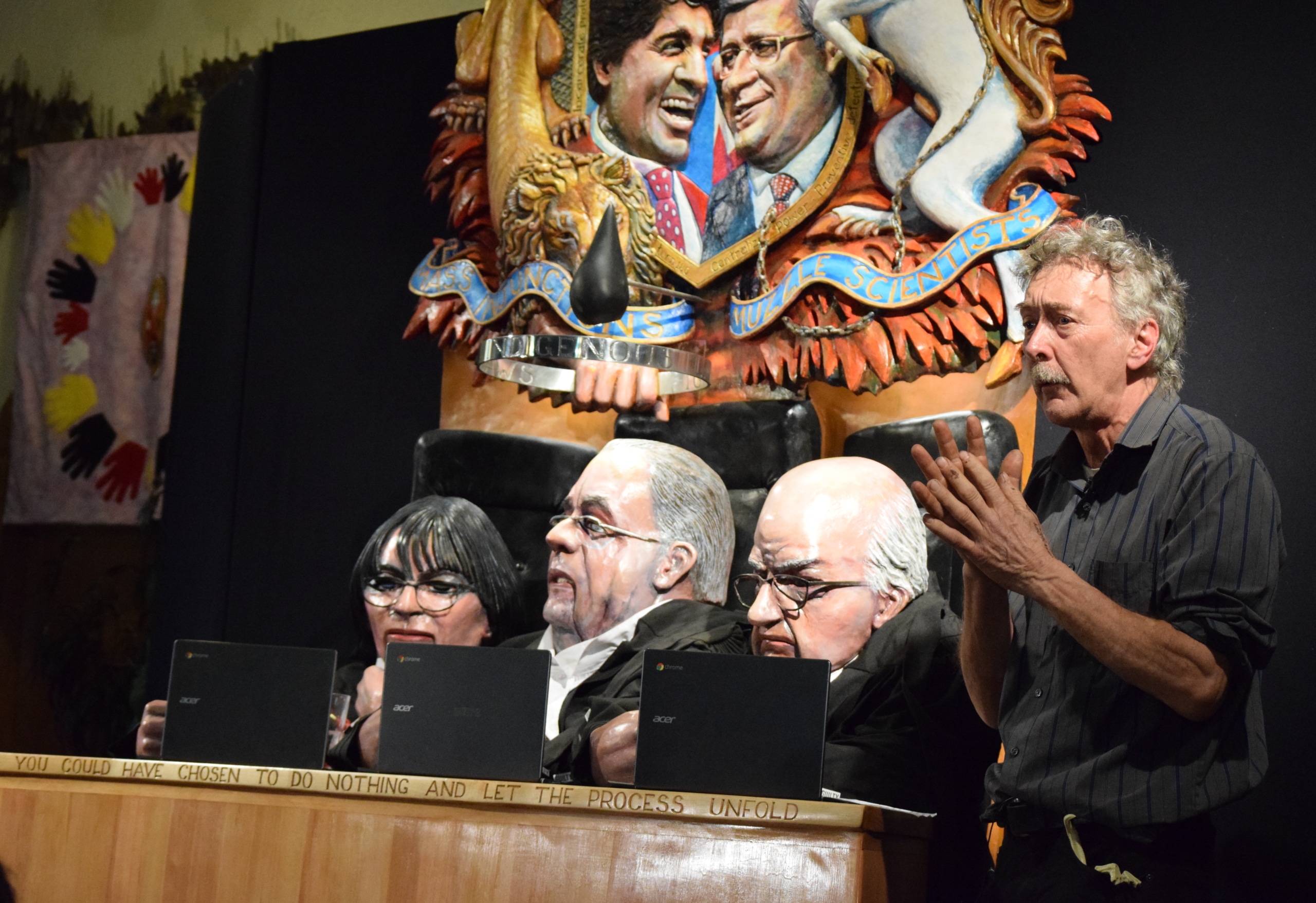 A caricature-like sculpture depicting three judges who have presided over pipeline injunction cases was unveiled on Tuesday — highlighting the absurd side of the colonial “justice” system.