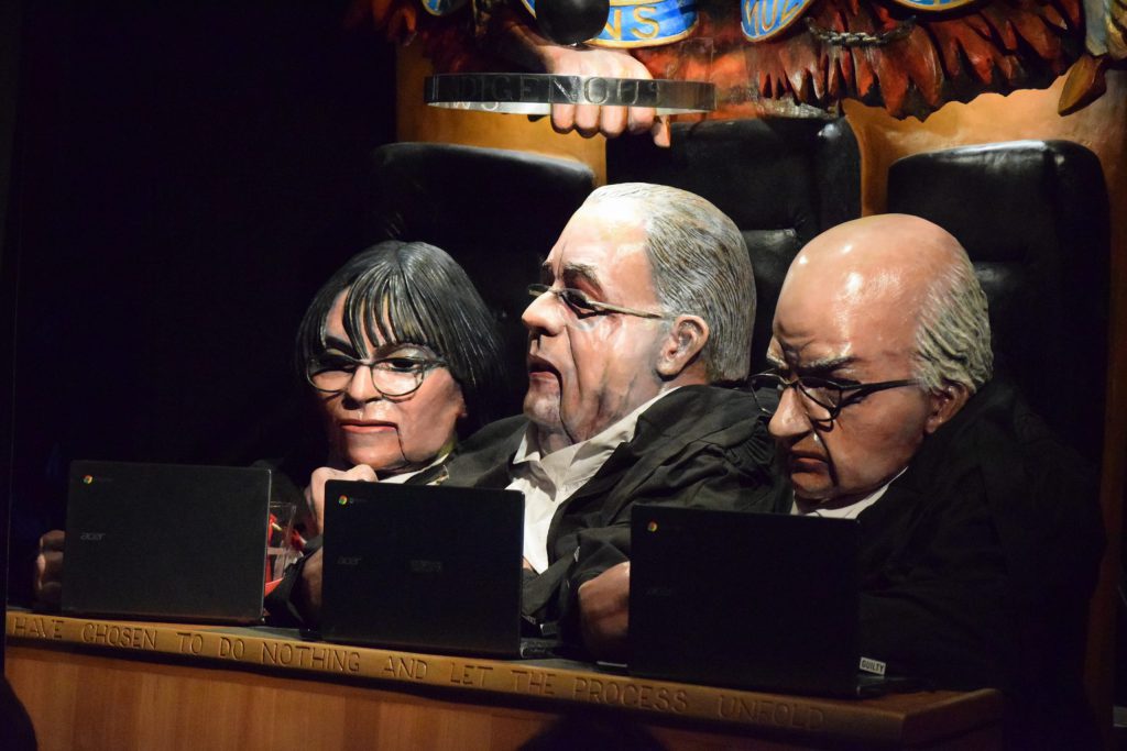 After the unveiling of the sculpture, puppeteers behind the piece controlled the mouths of the “judges,” imitating statements they’ve made in the courtroom, in a performance that ridiculed perceived biases in the justice system.
