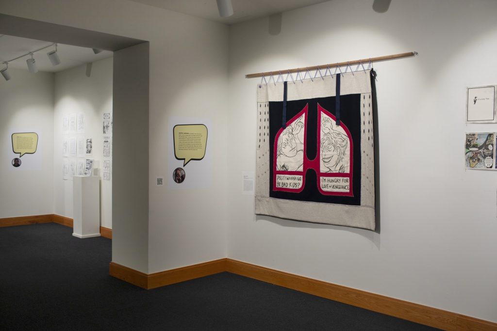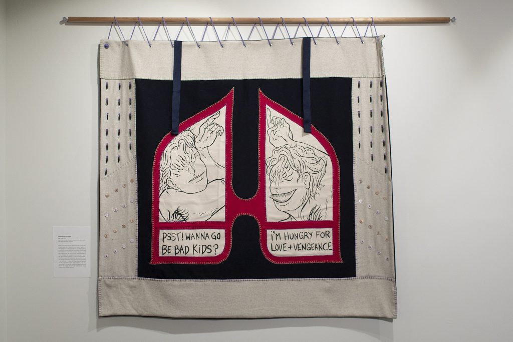 While viewers are met with an array of hand drawn and digital comic art interpretations, Harman’s textile installation (melton wool, embroidery thread, canvas, acrylic paint, plastic buttons, bone beads, glass beads, grommets) with his comic art hand-painted inside wing-shaped panels, is the most radical.