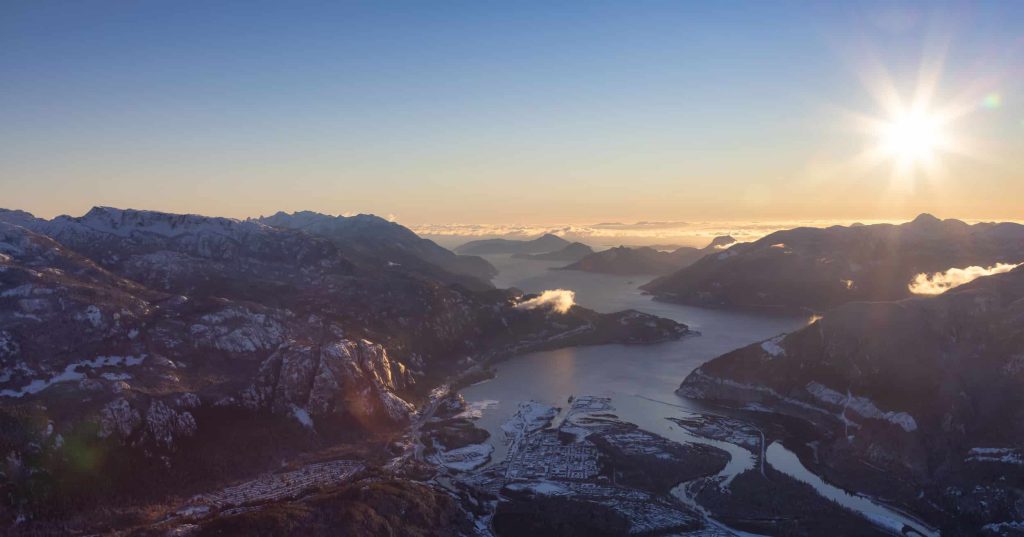 From above, Átl’ḵa7tsem (Howe Sound) looks like an open crab claw with a meandering, river-fed arm. Tucked into the base of its arm is the District of Squamish, an old mill town turned luxe outdoor haven midway between Vancouver and Whistler, that colonizes the name Sk̲wx̲wú7mesh. Where the crab claw meets the Salish Sea, the pincers hook around a cluster of islands.