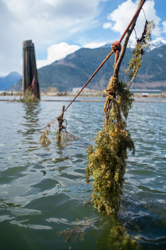 The Search for Slhawt’ began as a request from Elders. Kiyo-wil Robert Baker, and others, wanted to see a traditional harvest of herring roe on hemlock branches led by Youth and the wider community once more. As a staple food source for First Nations along the Pacific coast, herring eggs are typically collected in clumps from racks of kelp fronds or boughs of coniferous trees placed in shallow water.