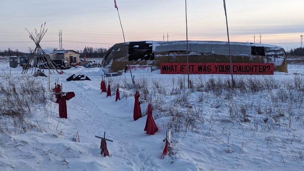 Around the same time as the injunction was enforced, sacred fire coals were transferred from Camp Morgan at Brady landfill, to the newly formed Camp Marcedes which held space behind the Canadian Museum for Human Rights in downtown “Winnipeg.”