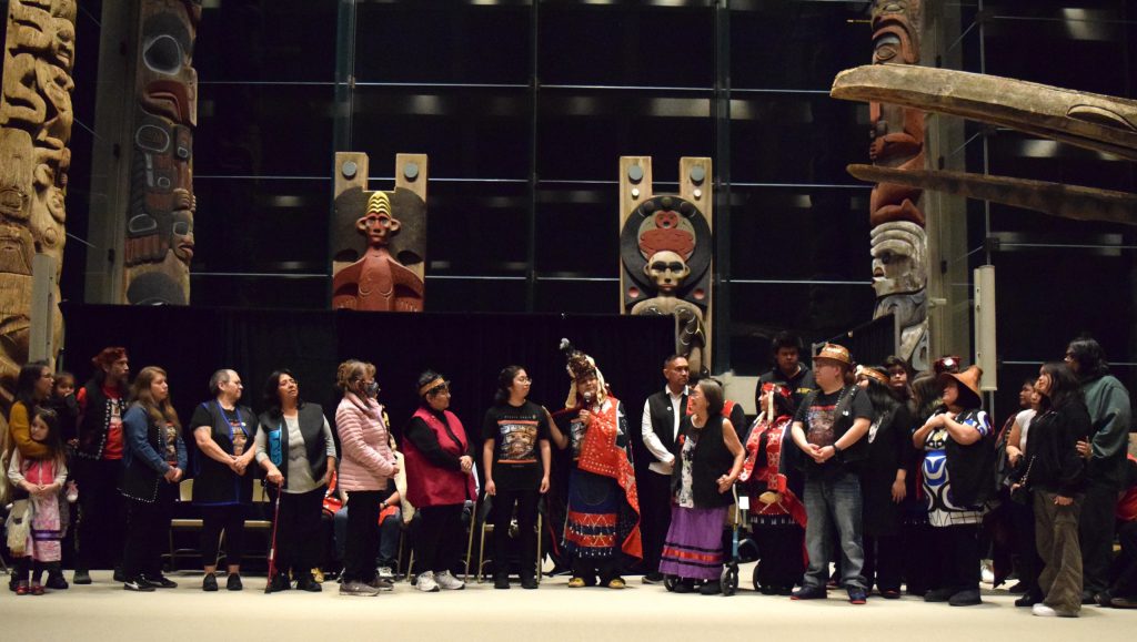 Pootlass, along with other leaders and families from Nuxalk, were in xʷməθkʷəy̓əm homelands Feb. 20 to herald the opening of Nuxalk Strong: Dancing Down the Eyelashes of the Sun — a new exhibition at MOA.