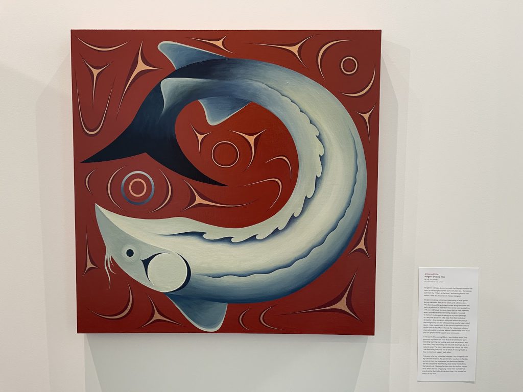 Picha’s painting, Sturgeon (Healer), features the large fish in an arc shape and is accompanied by an artist’s statement that explains the significance of the fish, which can live for up to 100 years.