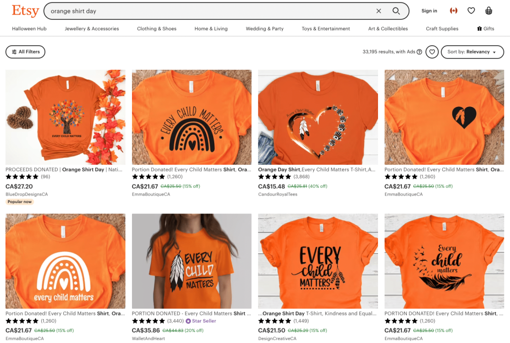 Everywhere you go, retailers remind you that you can pick an orange shirt up — don’t forget to buy your shirt by September 30! You can buy it at London Drugs or Walmart while grabbing toothpaste. Or you can get it shipped overnight from Etsy or Amazon, where the Indigenous designs are often stolen from artists. Each September, listicles proliferate with links to retailers. Reconciliation is available for $20, plus tax. ($40, if you got a chic cantaloupe-hued version from Aritzia before it sold out). On Twitter, a bot account has been replying to threads about Orange Shirt Day with a link to Amazon — scammers know there is money to be made off the potent combination of settler guilt and impulse shopping.