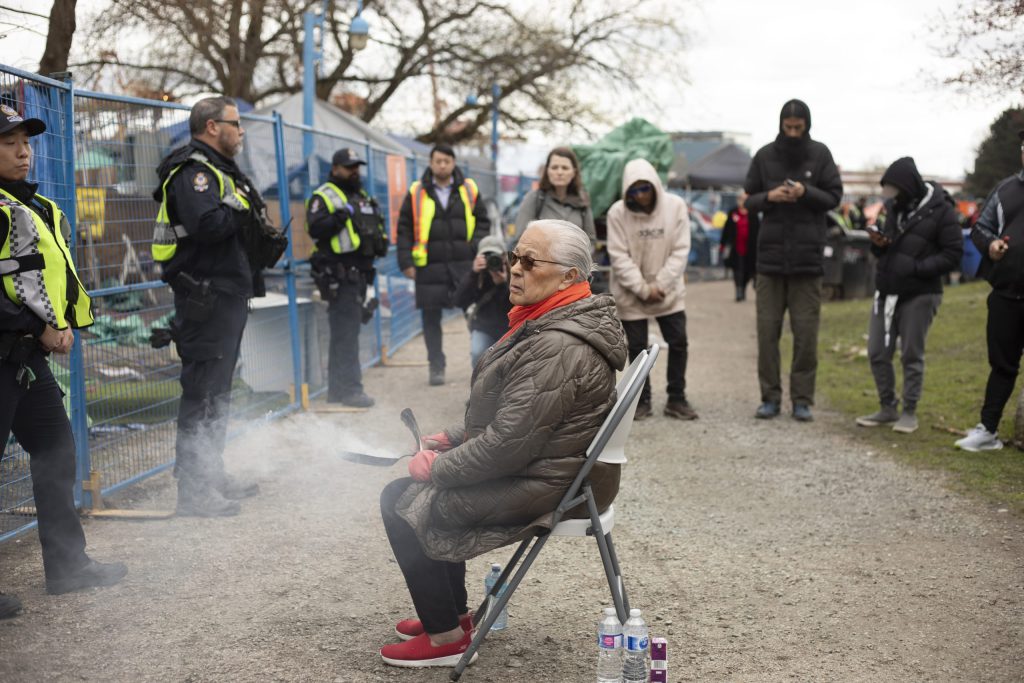 An Elder from Sḵwx̱wú7mesh Nation sat patiently waiting to offer medicine to a resident who, according to Muskikiway (Lynn Johnson), was sick and still in her tent. The Vancouver Police Department and Park Board refused to allow the Elder into the encampment to see her.