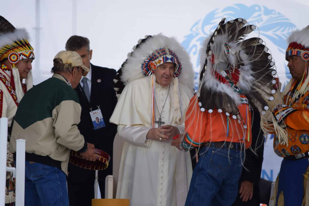 At the end of his address, Pope Francis was presented with a bonnet by Chief Wilton Littlechild, triggering an eruption of cheering as the Catholic leader briefly wore the elaborately beaded feather headdress with his robes.