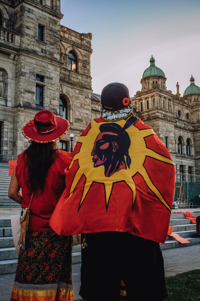 Dakota, a Cree, Gitxsan and Wet’suwet’en Youth, and their stepfather Alex Taylor-McCallum, a Kwakwa̲ka̲’wakw and Nuu-chah-nulth artist, performer, and cook, joined the rally at the B.C. Legislature on Sept. 18.