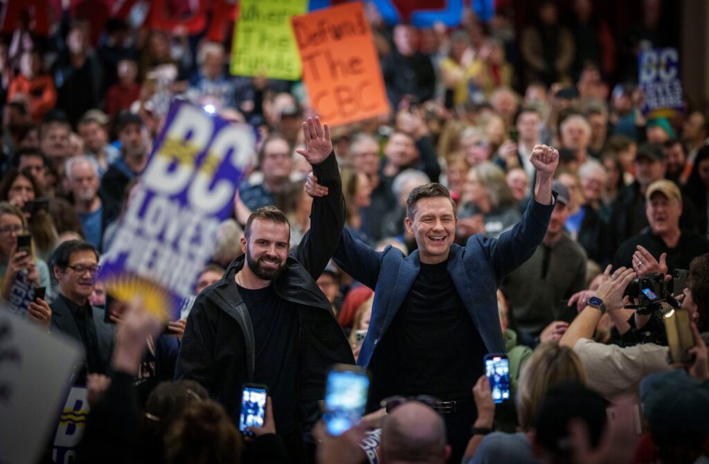 Aaron Gunn (left), Conservative candidate for North Island-Powell River, addresses a Jan. 14 rally in ‘Powell River’ alongside party leader Pierre Poilievre in a photo released by Poilievre’s campaign. Photo by John Lehmann, courtesy of Pierre Poilievre campaign/Facebook