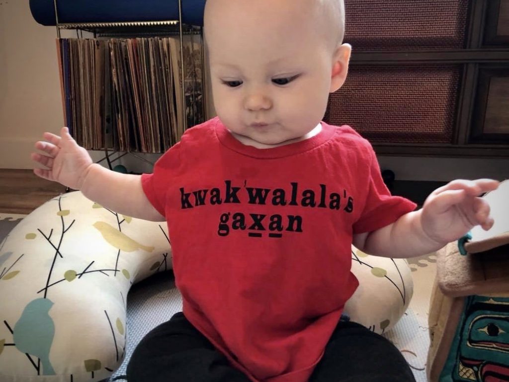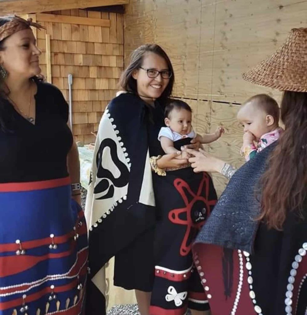 “Our teachings say that babies are still close to the spirit world, and ten moons is when they have decided to stay,” explains La̱lx̱sa̱n Dala’ogwa (Keisha Everson), who’s from the K’omoks First Nation. She’s also from the Gigal’ga̱m Walas Kwaguł of Tsax̱is.
