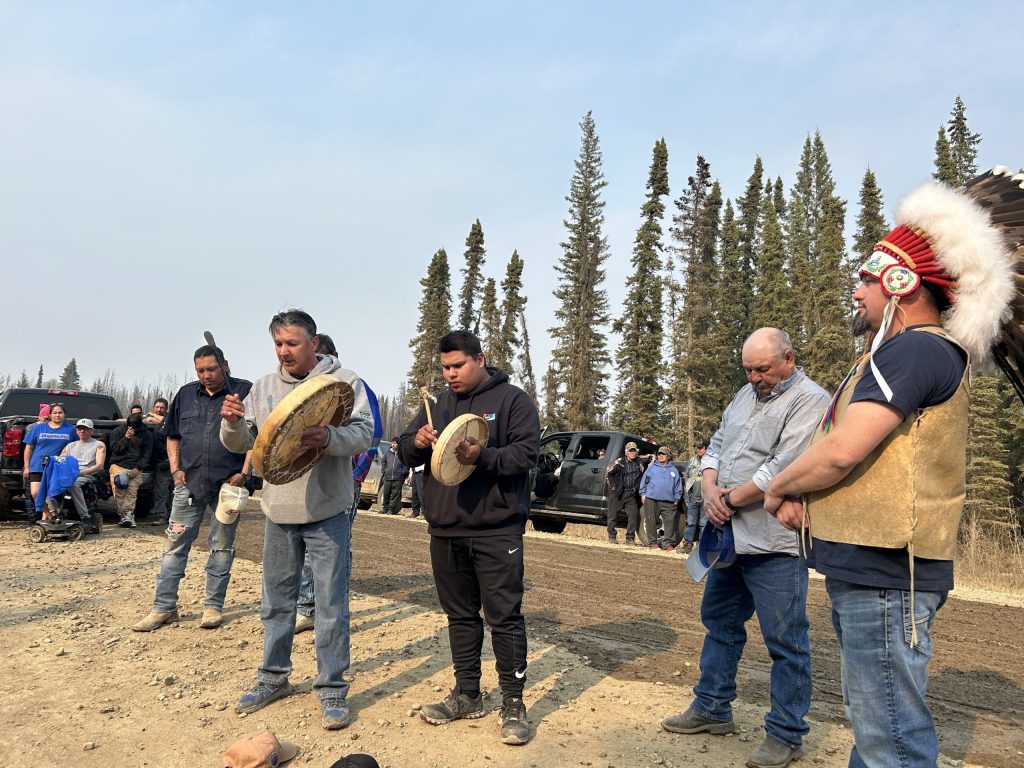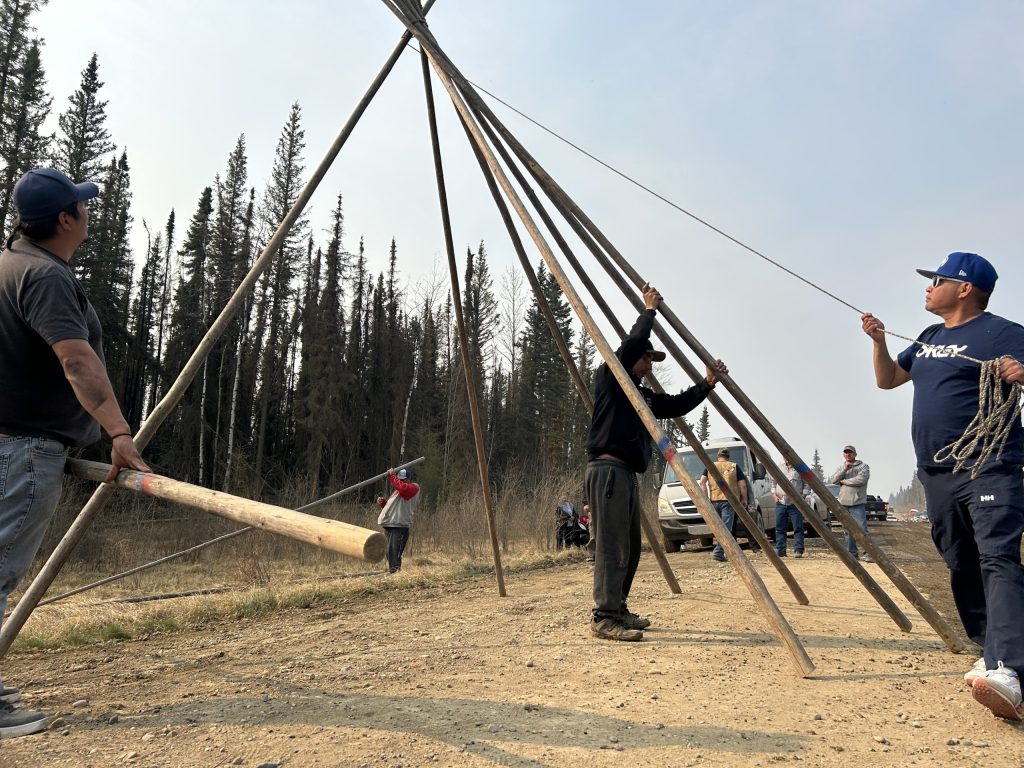 Vehicles and heavy equipment line both sides of the gravel industry road, along with a teepee, mobile kitchen, porta potties and lawn chairs. Elders are transported in by bus daily where they visit, play cards, swap stories, and offer support to elected leadership. Nearby, youth cut and hung to dry fresh moose harvested from the territory over a smouldering fire.