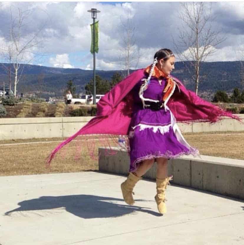 She explains that St̓aʔqʷaĺqs means shimmery or glittery patchwork dress in Nsyilxcən, the Syilx language. Her name was given to her by Celia Eneas.