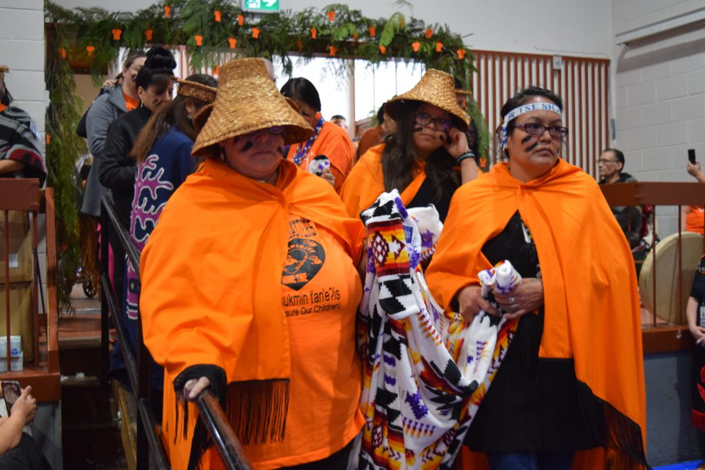 The day of the announcement, dozens of c̓išaaʔatḥ members entered their community gymnasium through a cedar-adorned doorway — many wearing orange shirts or regalia.