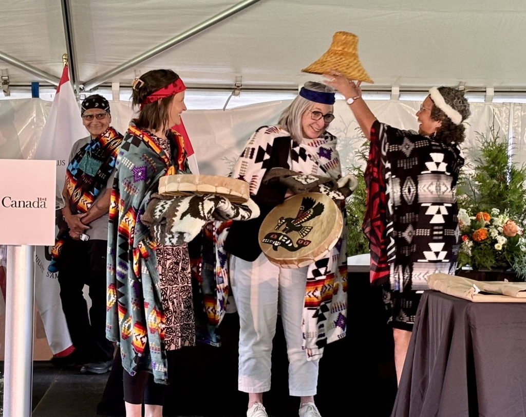 B.C. Minister of Children and Family Development, Grace Lore and Federal Minister of Indigenous Services, Patty Hajdu receive Quw’utsun gifts from Chief Cindy Daniels (Sulsulxumaat) during the June 24 ceremony. Photo by Jordan Kawchuk/The Discourse