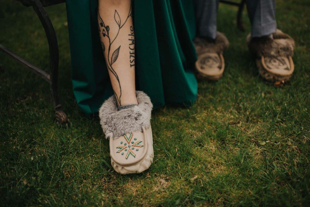 The couple wore locally-made moccasins down the aisle, and exchanged rings from a berry-stained birchbark basket before revealing they would be having a daughter.