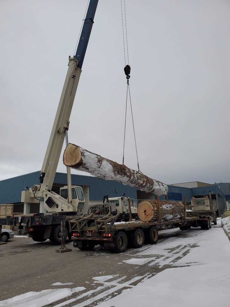 The first step is getting the trees. For the current batch of canoes, two cottonwood trees were brought in from around Vernon, B.C. on a flatbed truck. They were large enough that they needed to be lifted off by a crane.