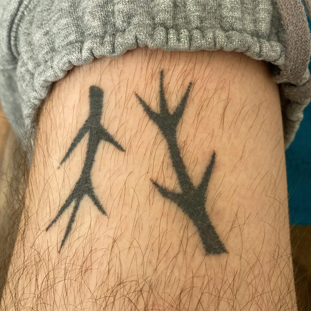 The mentees were also required to tattoo themselves as Kaszas watched over Zoom. Louis tattooed a pictograph-style image of fir boughs right above his left knee.