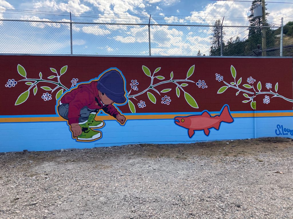 Known for his vibrant murals that honour the syilx Nation and its members, as well as captikʷɬ teachings and environmental protection, Louis knew he wanted to create a mural that highlighted the reverence the Nation has for water and for salmon.