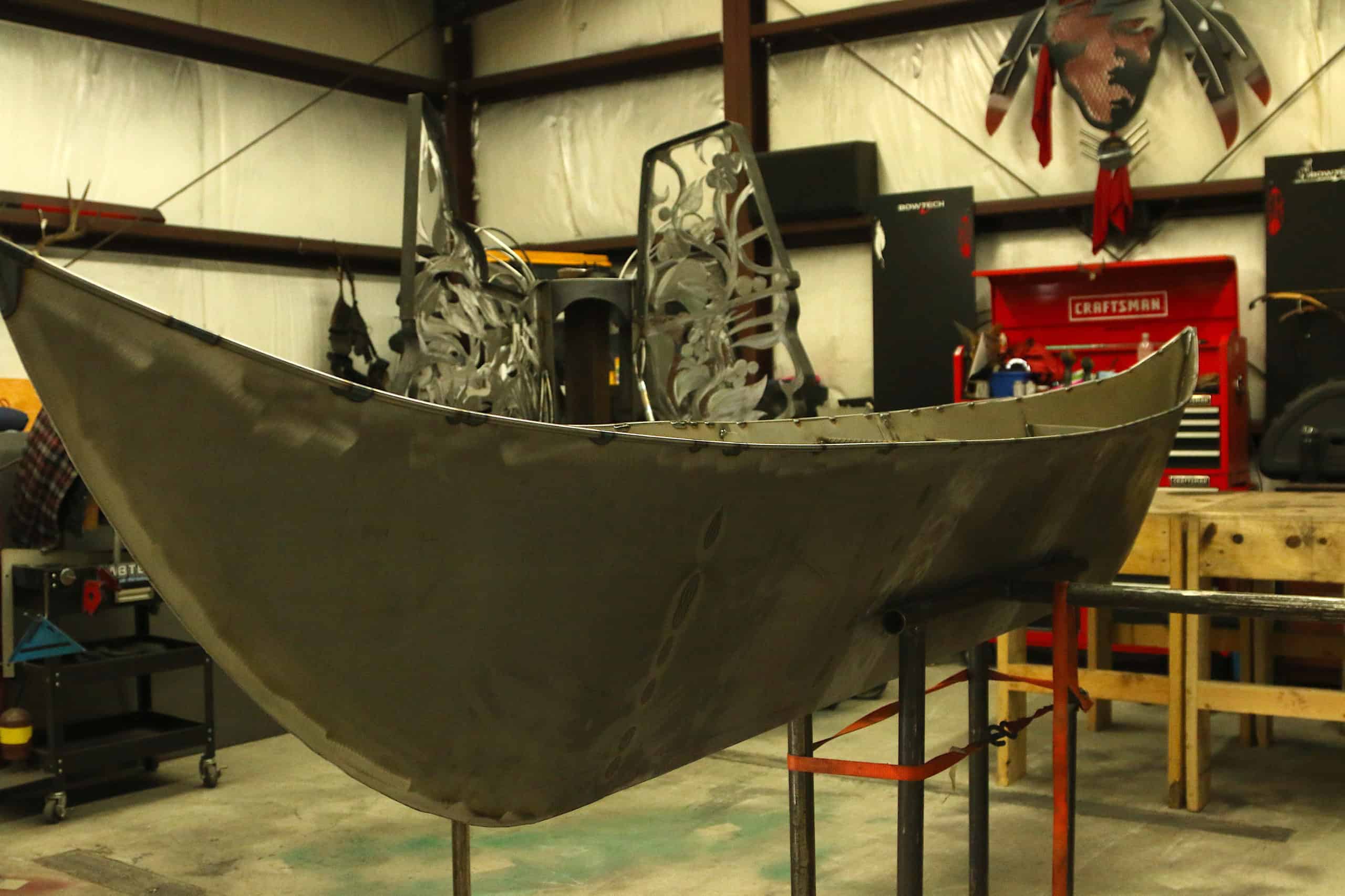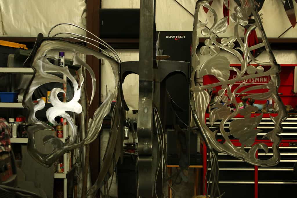 The sculptures are made entirely of steel, both mounted on a hand-carved pole with pictographs engraved along the sides. He is also working on a fourteen-foot standing steel feather.