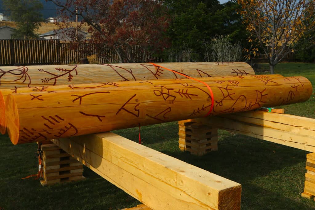 George collaborated with Les Louis, another Indignenous artist from the Okanagan, to carve the poles and paint in the pictographs.