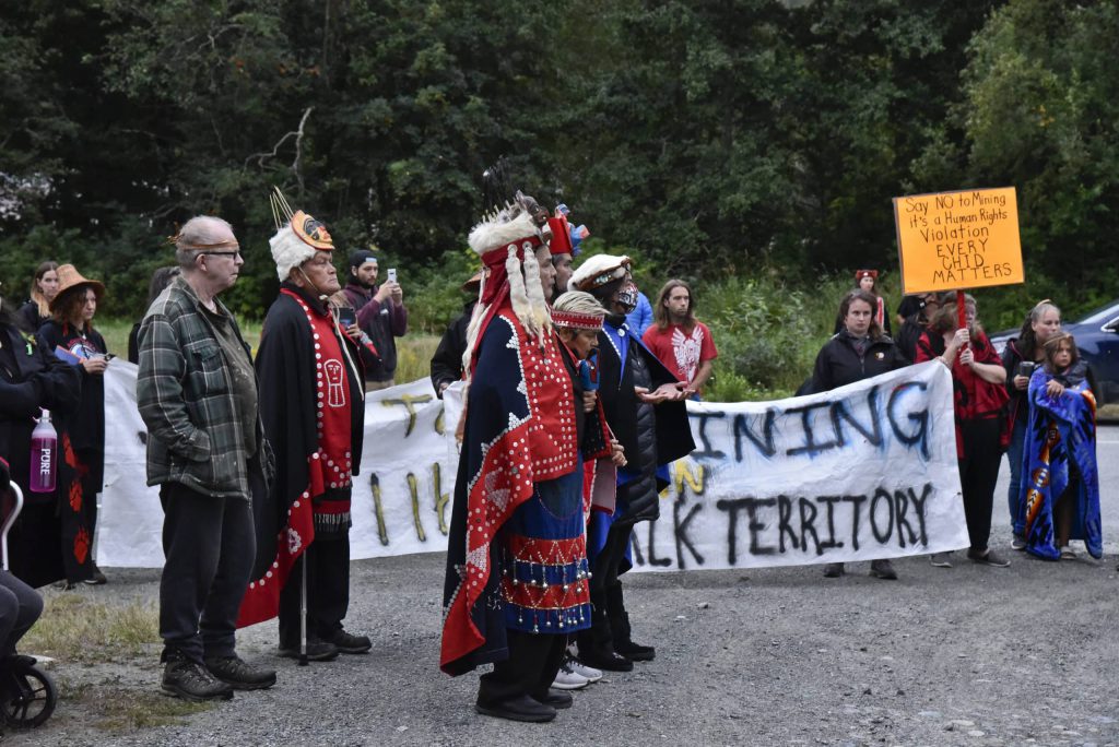 Hereditary and elected leaders were supported by both Nuxalk and non-Indigenous community members, to “say no to mining” and call for respect for Nuxalk laws on Aug 16, 2021. Photo by Michael Wigle