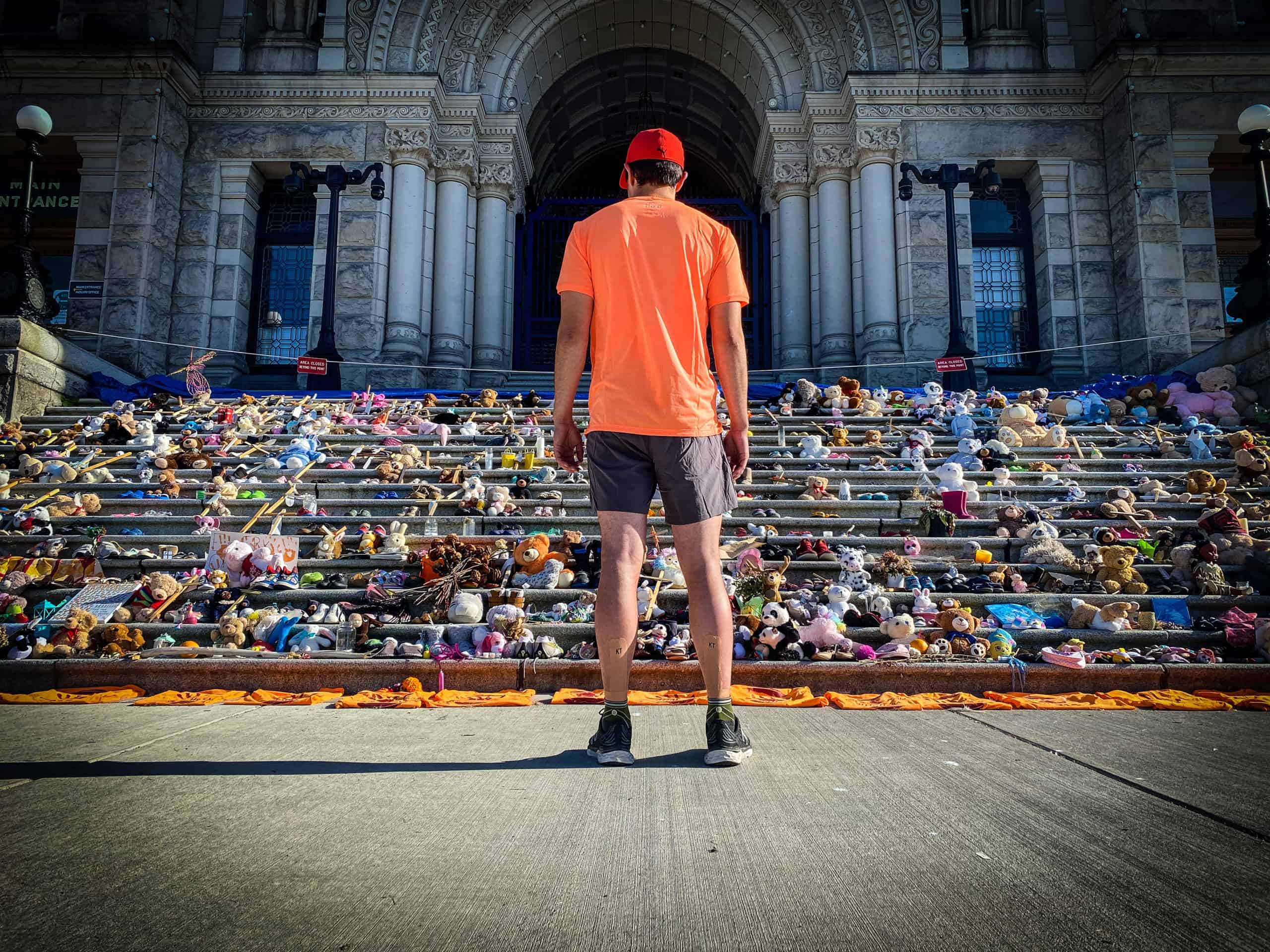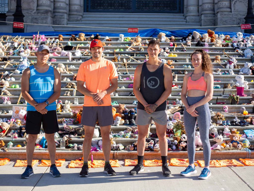 Two Indigenous men, Mark Andrews and Dakota Sun Dakota Sun Knïfe joined him on Thursday, along with Laura Lockwood, meeting him in front of the legislature building where a memorial has been placed, where hundreds of stuffed animals, candles, and orange shirts blanketing the stairs.
