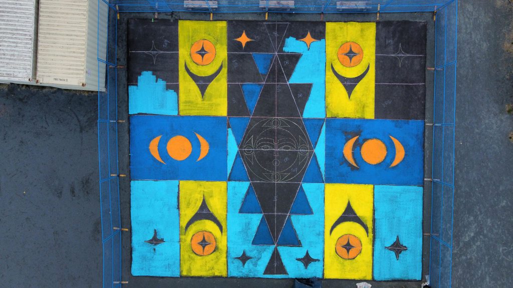 “[The mural] is a blanket design that honors the four directions and the Ancestors,” she says. “Each corner of the court includes one of the four directions.”
