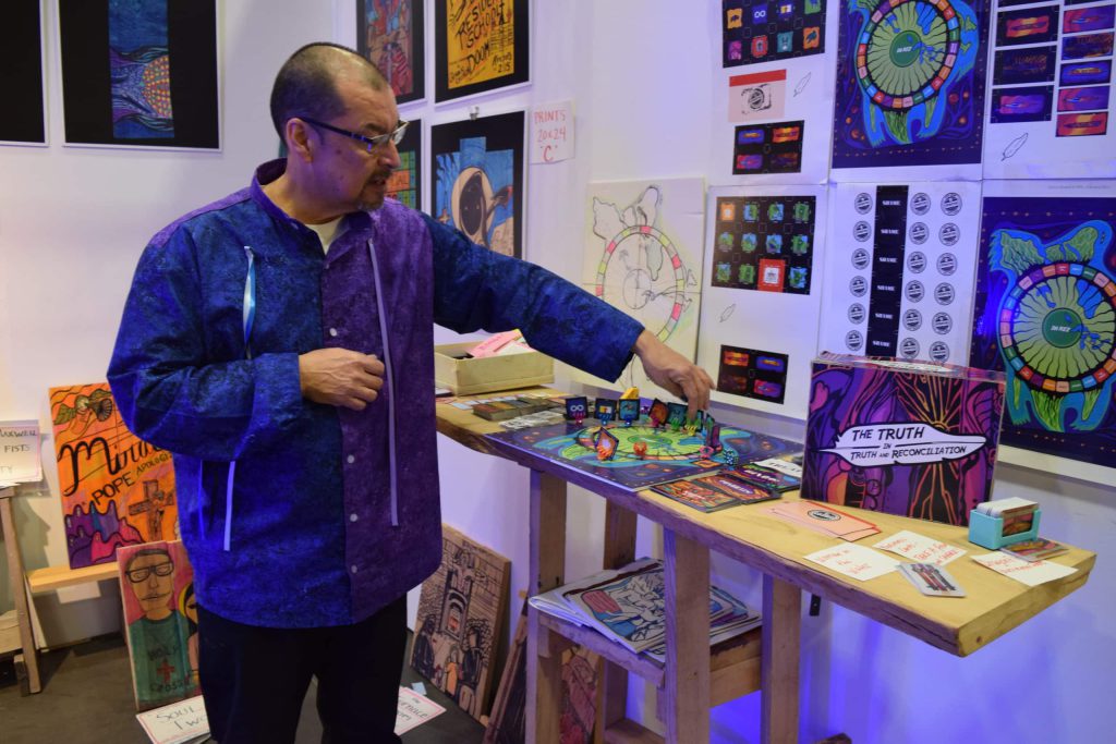 As an Indigenous language teacher turned artist, Corbiere – who is Anishinaabe and currently lives in Cowichan territory — used elements from both of his professions to create The Truth in Truth and Reconciliation. The board game, emblazoned with Corbiere’s signature vivid art style, teaches its players about Canada’s colonial history.