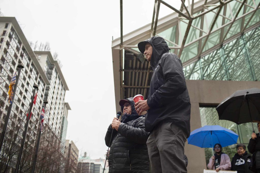 Two men wearing black jackets stand in front of a courthouse in downtown Vancouver during a rainy day