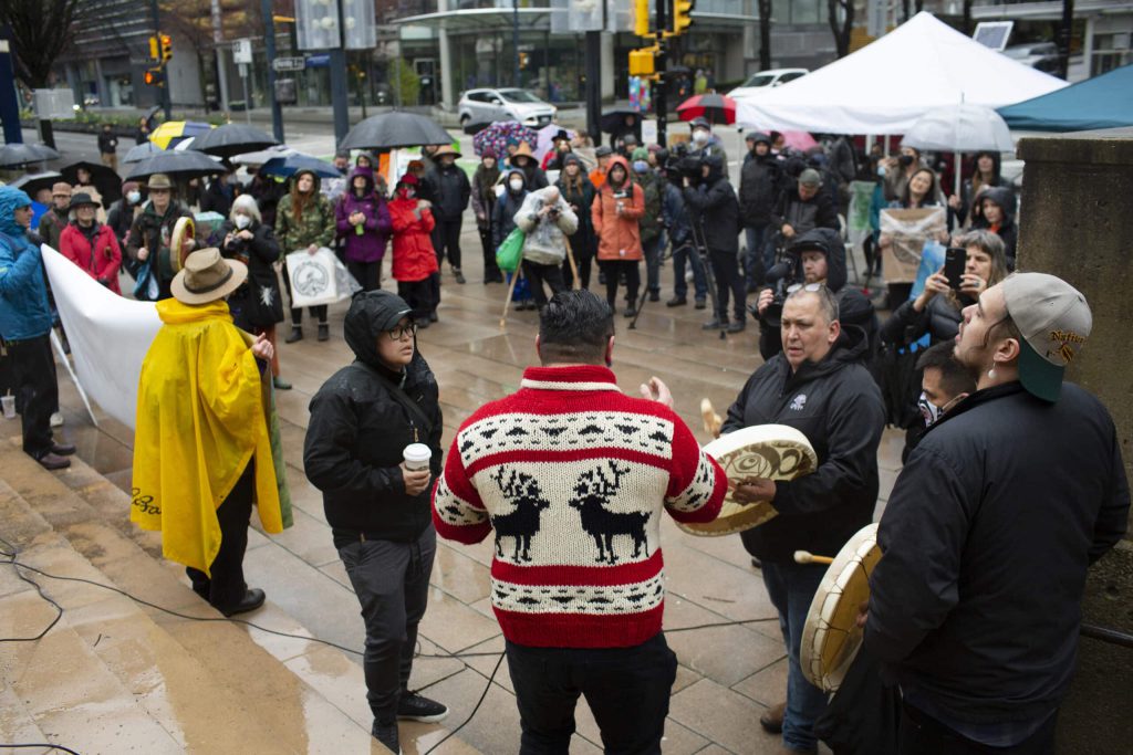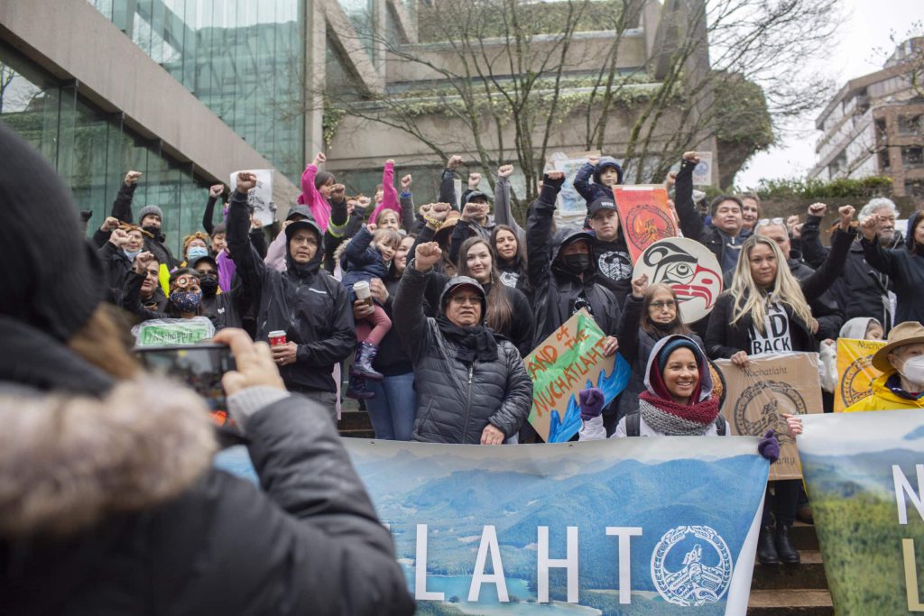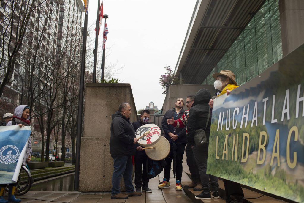 Nuchatlaht supporters stand outside the B.C. Supreme Court in Vancouver on the first day of the Nuchatlaht trial. March 21, 2022.